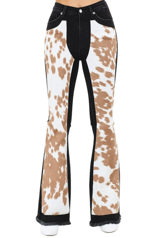 Ride into style with our Rodeo Bell Bottom Jean! These Western-inspired jeans elevate any outfit with front faux cow hide inserts and a flattering 34\" inseam length. Made in the USA with stretch denim, they're as comfortable as they are stylish. Moo-ve over, basic jeans!